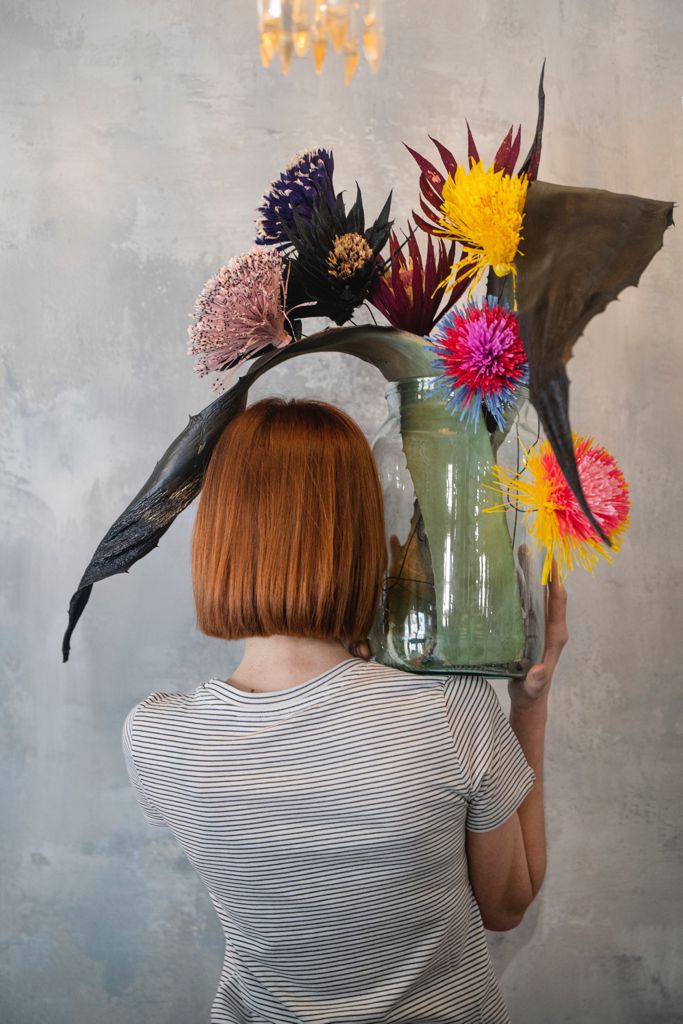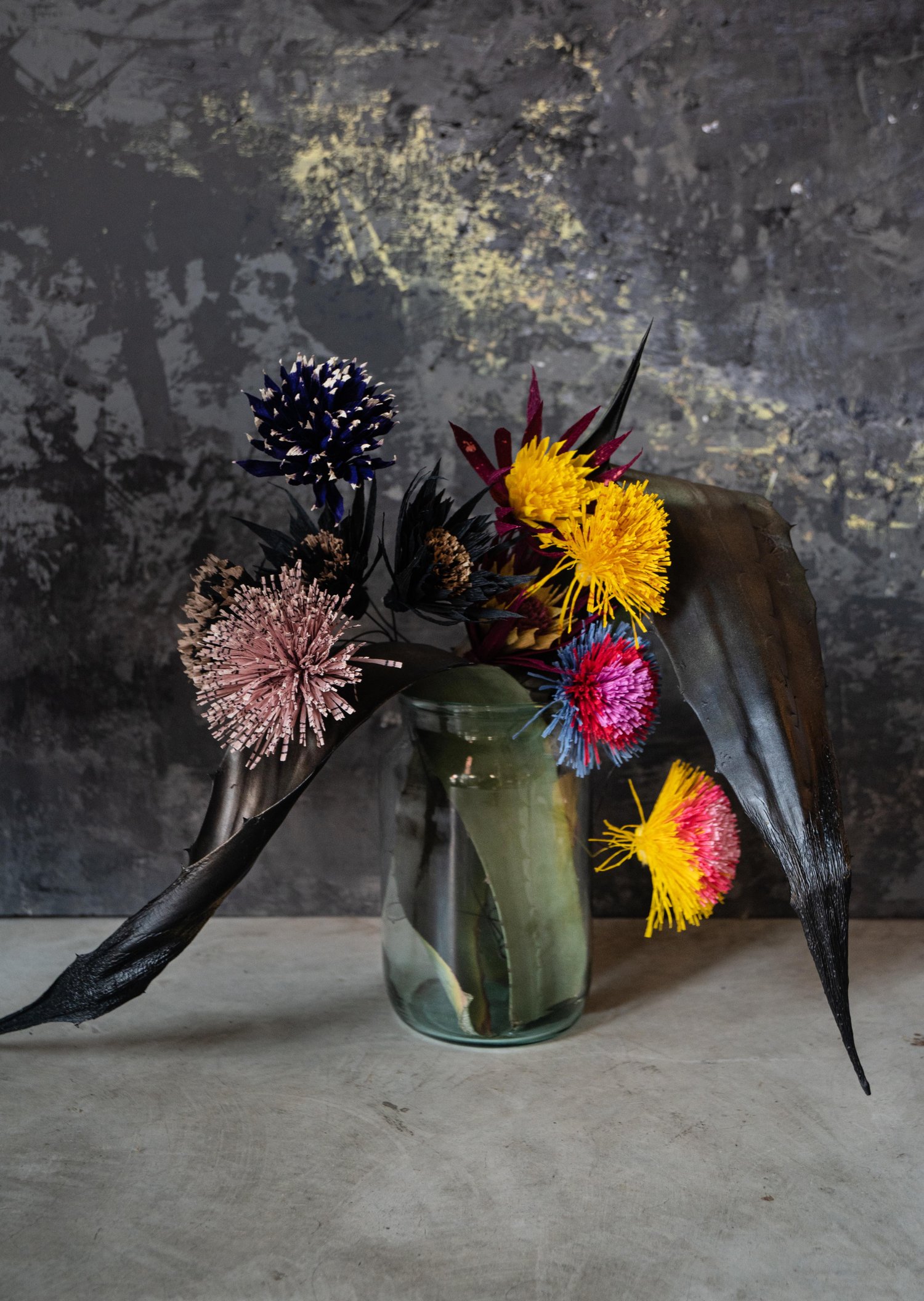 Composizione con fiori di carta di Andrea Merendi e foglie di agave dipinte di nero