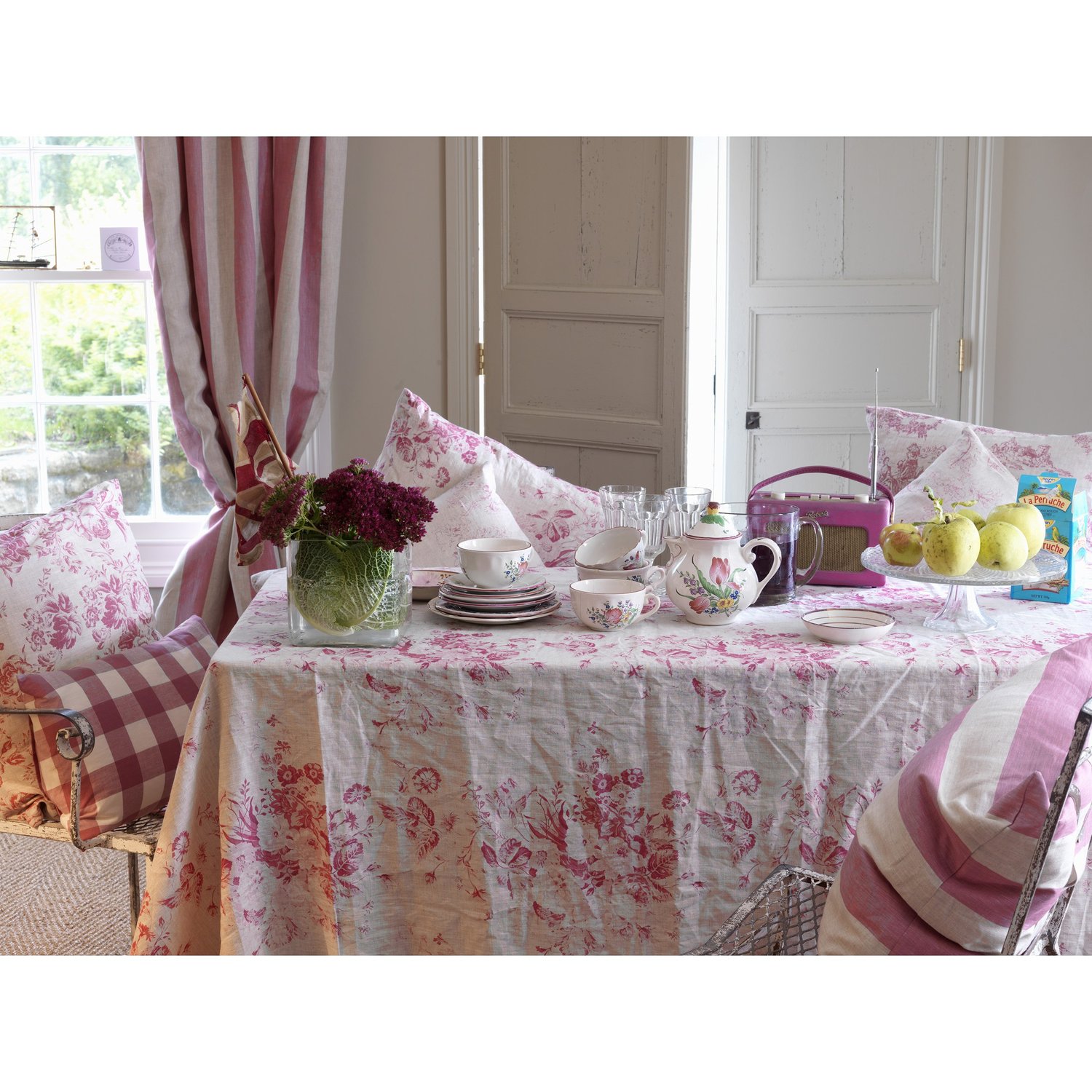 Bellissimo tessuto di puro lino a stampa floreale firmato Cabbages&Roses®, perfetto per l'arredo di casali rustici e interni urbani dal tocco vintage elegante. Adatto per tende e tendaggi, cuscini di bellezza e tappezzeria leggera.