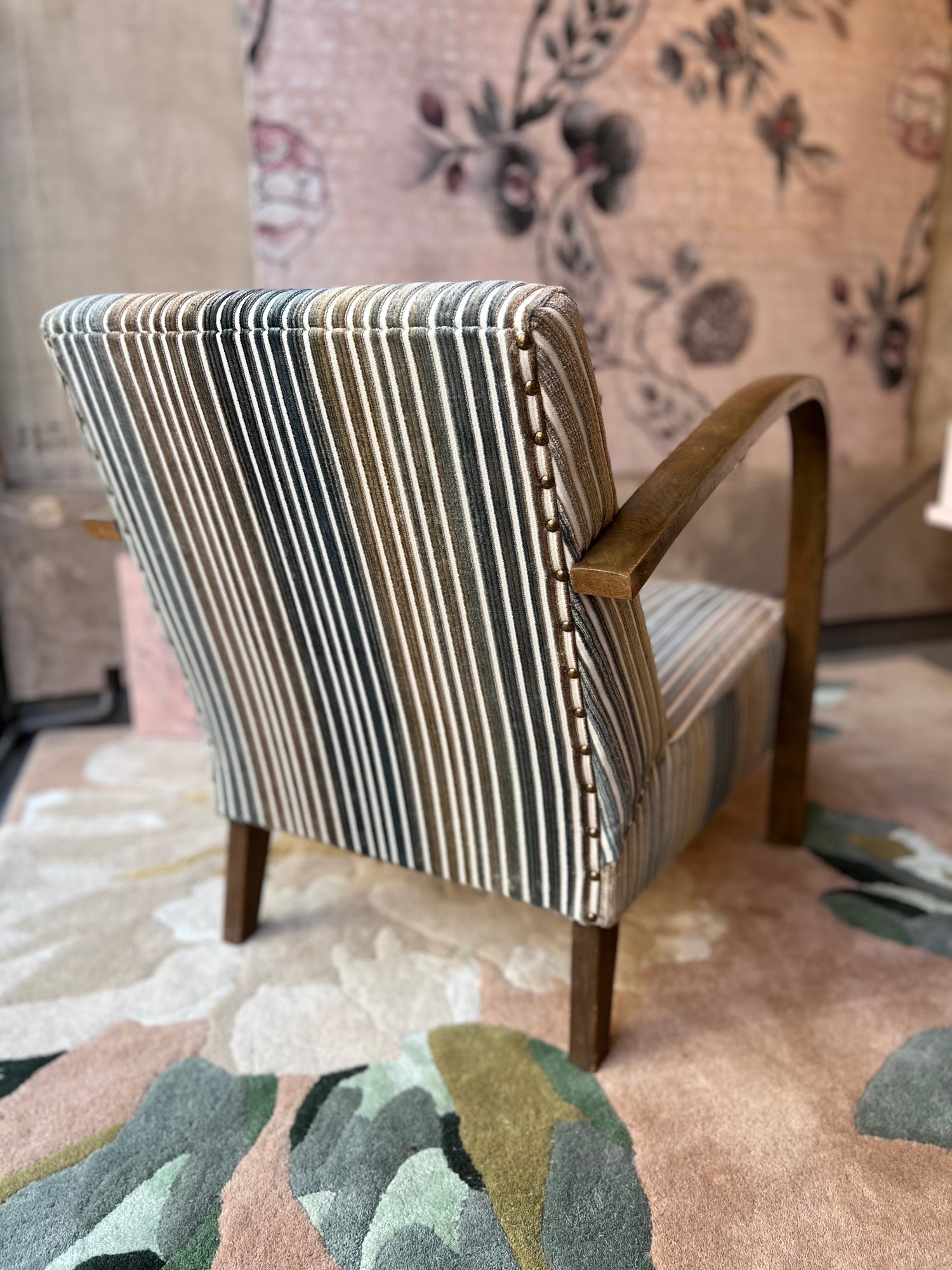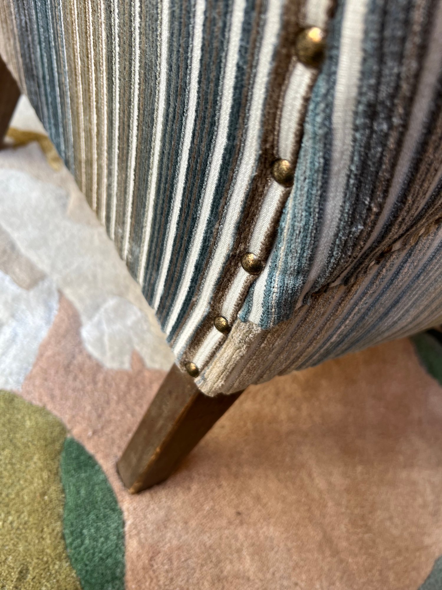 Per questa questa splendida poltroncina in stile Art Deco completamente rifatta a nuovo, con chiodini in ottone originali, abbiamo scelto un elegante velluto épinglé. Esplosioni di lussuoso velluto si distaccano orgogliosamente da un raffinato fondo jacquard, creando una distesa di strisce tattili che sfumano lungo il tessuto, in una ricca combinazione di colori. Ogni riga é rifinita con una bordatura ad occhielli, che le conferisce un aspetto elegante e curato e una texture unica.